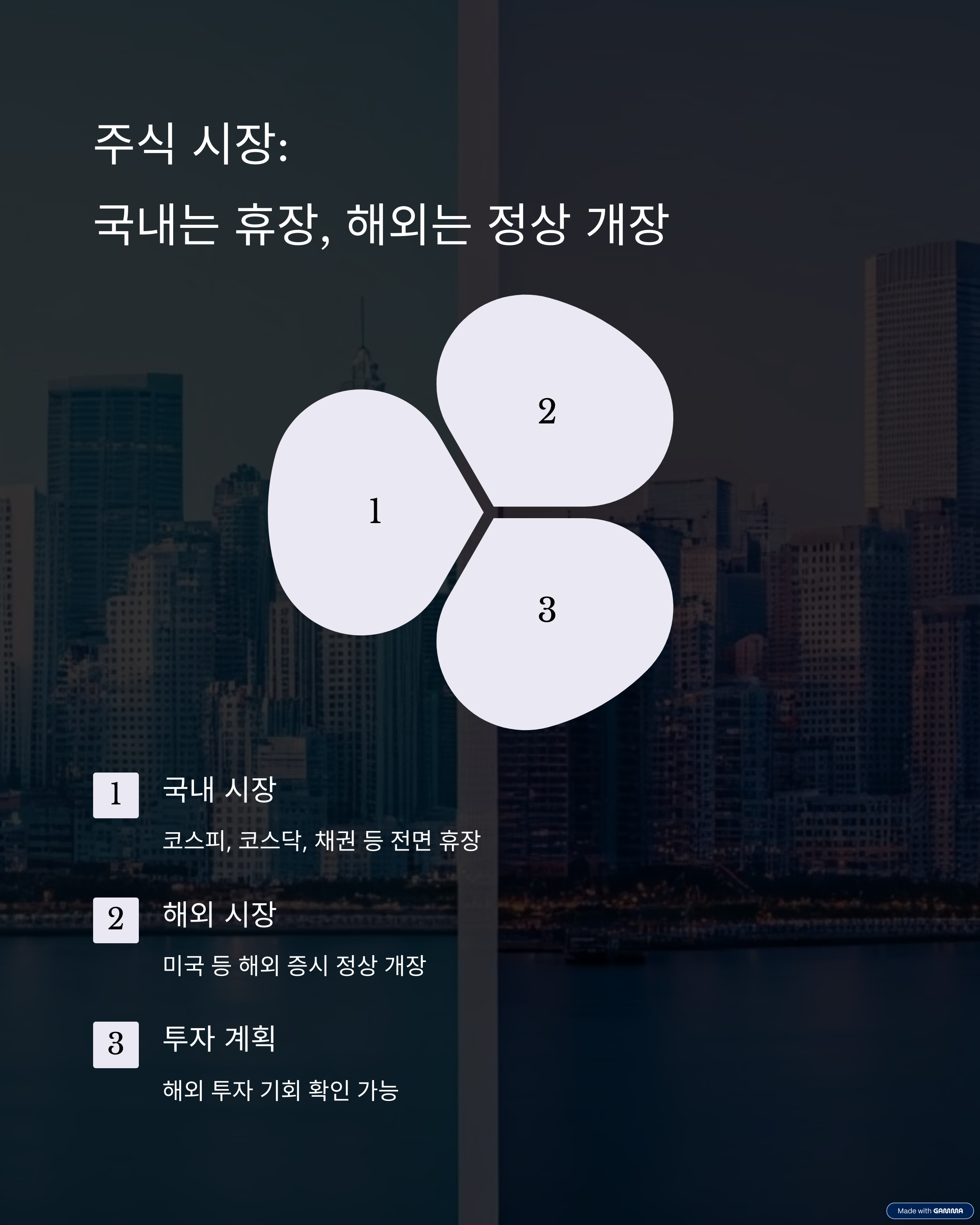 | 주식시장 | 휴장 | 코스피, 코스닥, 코넥스, 파생상품, 채권 등 국내 모든 금융시장 휴장. 미국 등 해외 증시는 정상 운영. |